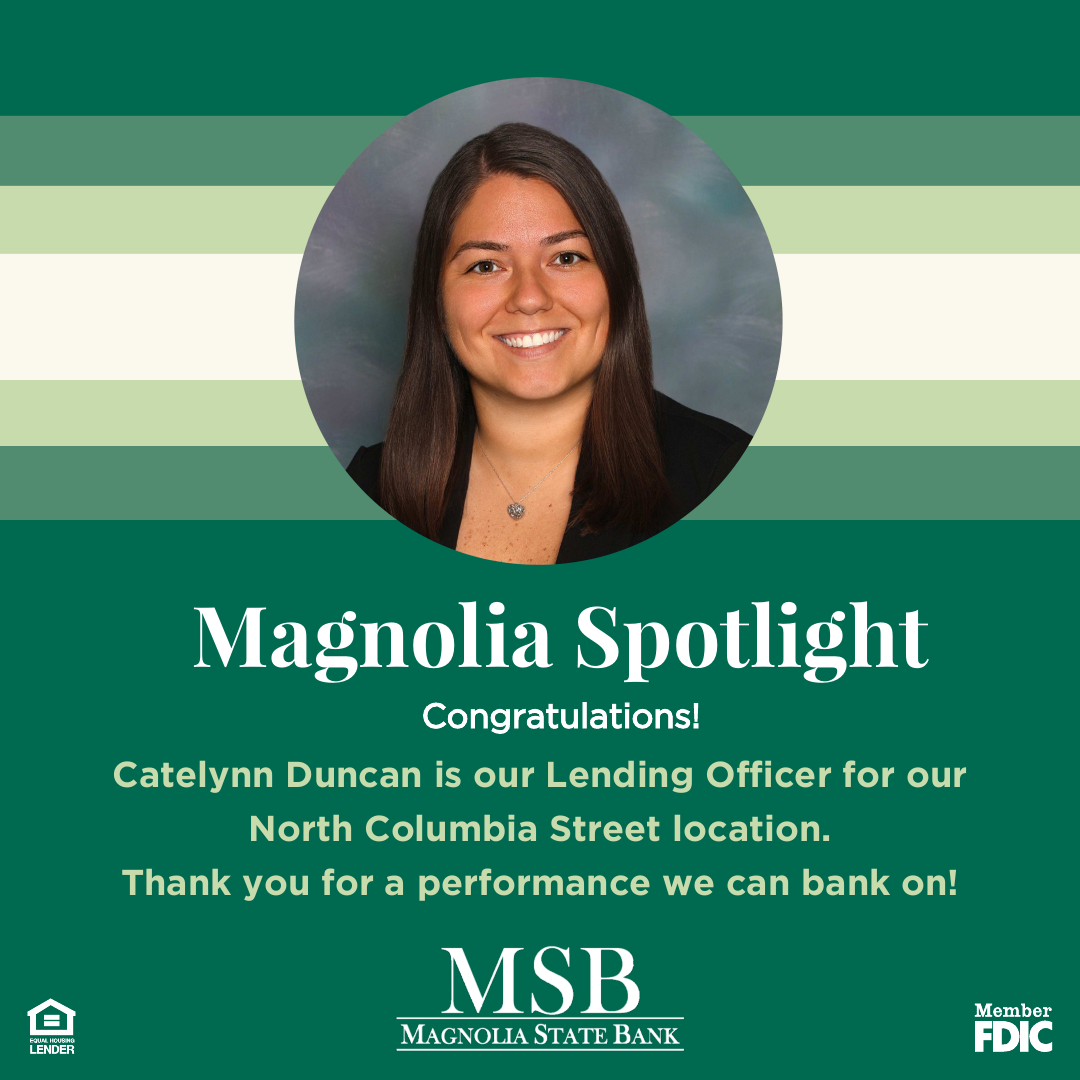 Magnolia State Bank is proud to announce that Catelynn Duncan has officially moved to our 2451 N. Columbia Street office in Milledgeville! Catelynn is a Lending Officer for the Milledgeville area as well as our Collections Manager.
