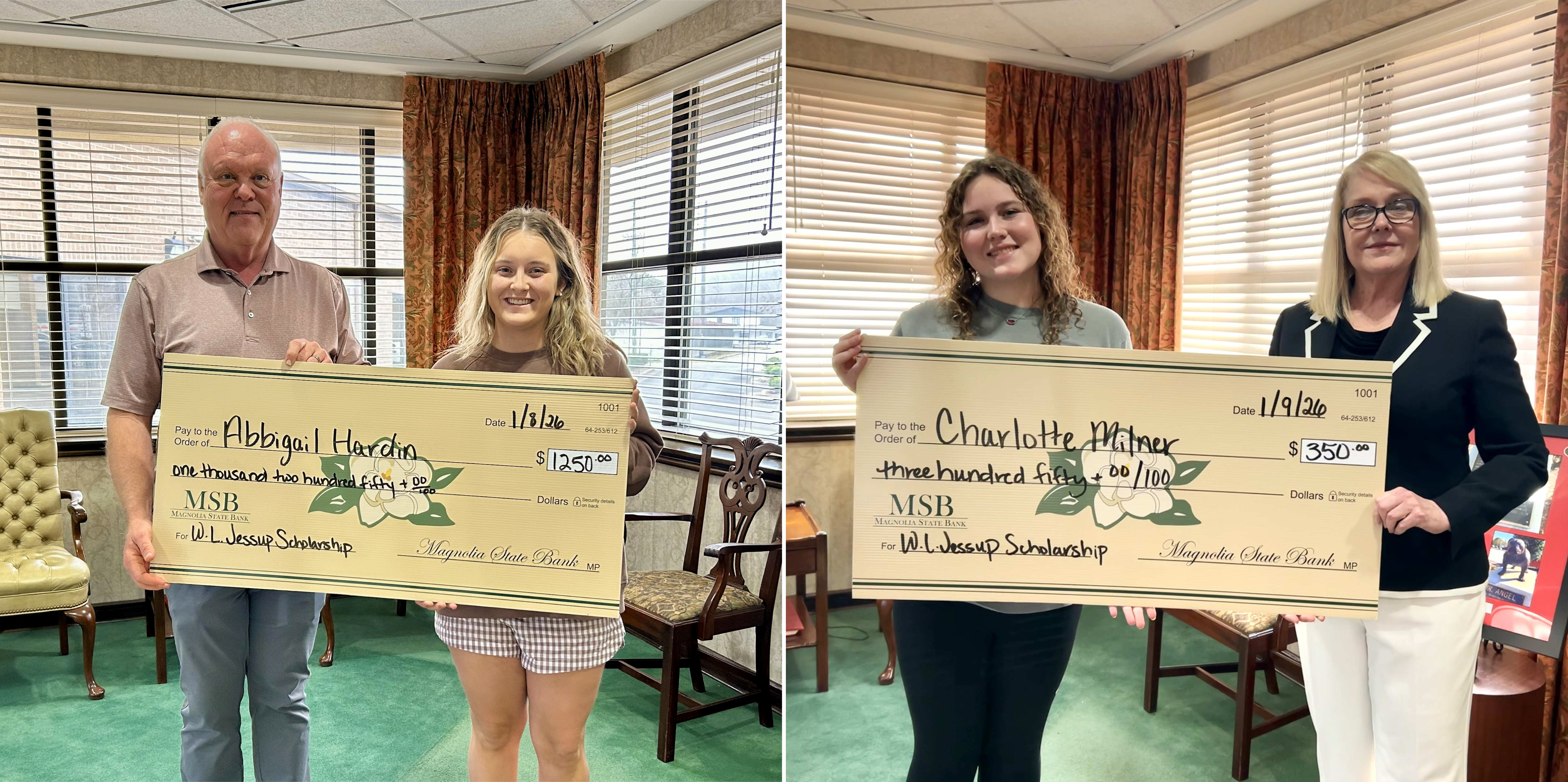 The W. L. Jessup Memorial Scholarship Award has been instituted for more than 18 years at Magnolia State Bank, and was established in the memory of Mr. W. L. Jessup, one of our banks founding fathers. The scholarship was created to assist with the continuing education costs for those interested not only in our locally owned financial institution, but also for seniors who serve on the Magnolia State Bank's Junior Board of Directors. This award has been granted to more than 100 graduating seniors, and has substantially contributed to their paths for higher education. This scholarship has been instrumental in helping form lives that contribute positively to local and surrounding communities.