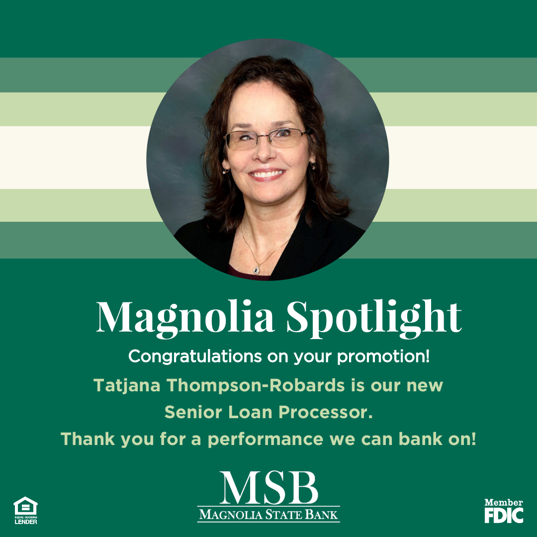 Magnolia State Bank is proud to announce that Tatjana Thompson-Robards has been promoted to Senior Loan Processor!