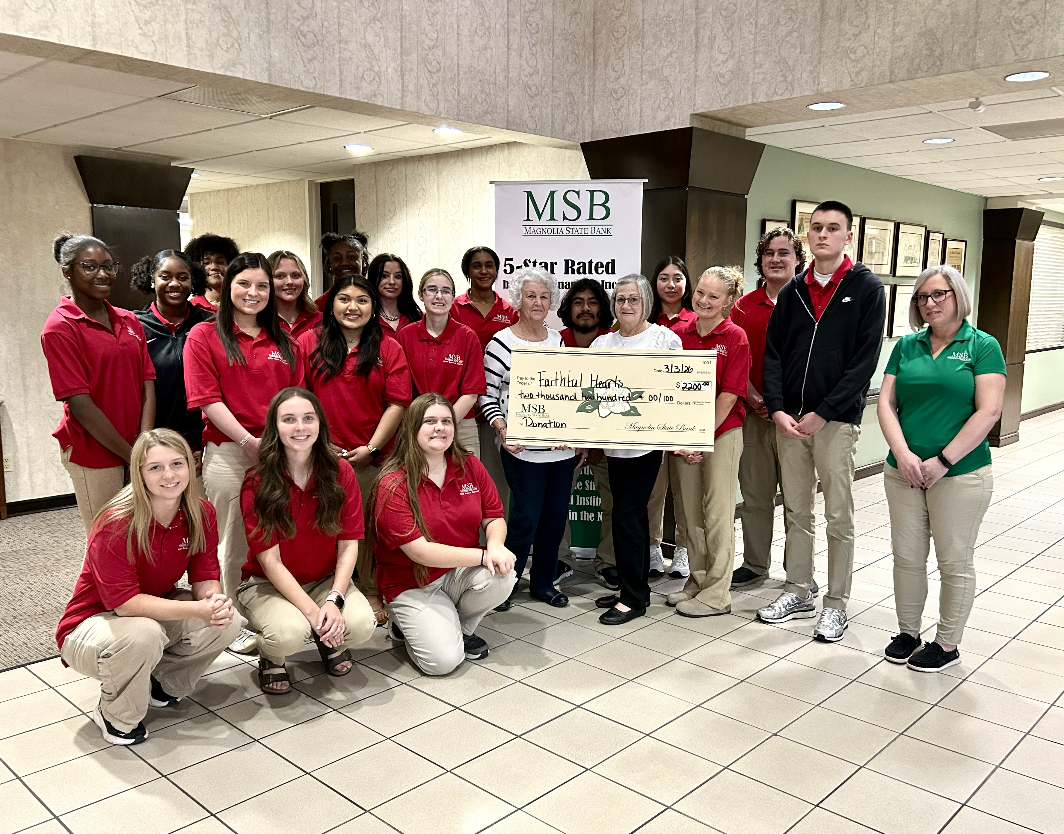 We are incredibly impressed with the initiative these students showed. Together, Magnolia State Bank and the Junior Board raised $2,200 for this amazing organization! Thank you to everyone in the community who donated or purchased a ticket. Your contributions will go a long way in supporting Faithful Hearts!